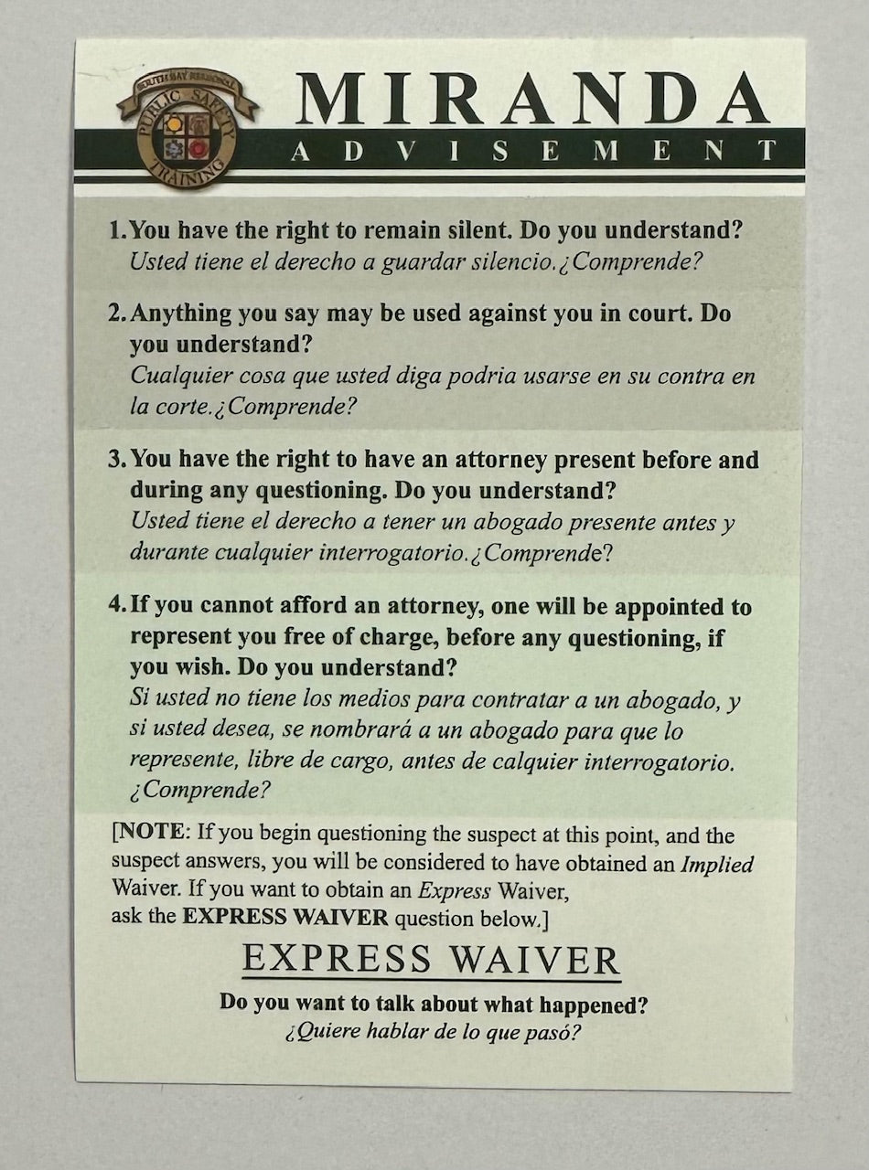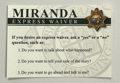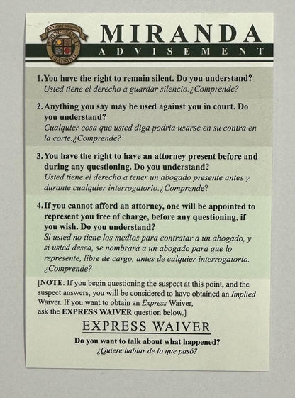 Business card sized Miranda Advisement Card.